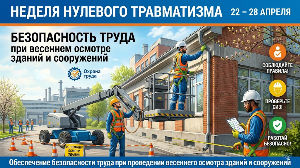 В соответствии с пунктом 31 приложения 4 к Государственной программе «Сбалансированный рынок труда» на 2026 – 2030 годы, утвержденной постановлением Совета Министров Республики Беларусь от 02 декабря 2025 г. № 699, плана работы по охране труда на 2026 год в период с 23 марта 2026 года по 28 марта 2026 года с целью профилактики нарушений норм охраны труда, предотвращения случаев производственного травматизма и обеспечения безопасности и здоровья работников на рабочих местах в учреждении здравоохранения «Клецкая центральная районная больница» проводится Неделя нулевого травматизма по теме: «Обеспечение безопасности труда при проведении весеннего осмотра зданий и сооружений».