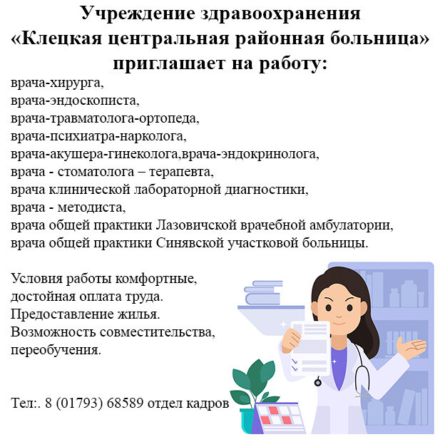 Учреждение здравоохранения «Клецкая центральная районная больница» приглашает на работу: врача-хирурга, врача-эндоскописта, врача-травматолога-ортопеда, врача-психиатра – нарколога, врача-акушера-гинеколога, врача-эндокринолога, врача — стоматолога – терапевта, врача клинической лабораторной диагностики, врача — методиста, врача общей практики Лазовичской врачебной… Подробнее »Учреждение здравоохранения «Клецкая центральная районная больница» приглашает на работу: